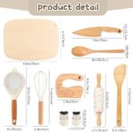 • Παιδικό Σετ Κουζίνας: Το σετ μαγειρικής για παιδιά περιλαμβάνει 1 × ξύλινο μαχαίρι, 1 × παιδικό ξύλινο μαχαίρι, 1 × ξύλινη επιφάνεια κοπής, 1 × πλάστη, 1 × κουτάλι, 1 × σπάτουλα, 1 × σουρωτήρι, 1 × αυγοδάρτη και 2 × καλούπια αποτυπώσεων. Η ποικιλία εργαλείων κάνει το παιχνίδι στην κουζίνα ακόμη πιο διασκεδαστικό.